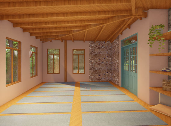 O espaço zen é um amplo salão destinado à prática de yoga, arteterapia e outras atividades corporais e espirituais. Esse ambiente foi pensado para promover o bem-estar e a conexão com a natureza, proporcionando um refúgio de tranquilidade e renovação, rente a uma Área de Preservação Permanente e no espaço com maior privacidade do terreno.